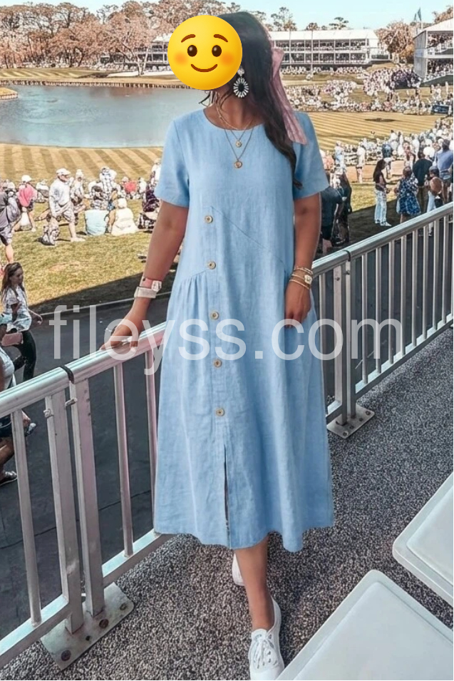 This flowing maxi dress features a soft blue linen fabric with a side button detail and front slit. Short sleeves and round neckline offer a simple, comfortable look. Functional pockets add practicality. Ideal for warm days or casual outings. Timeless style with a bohemian touch.