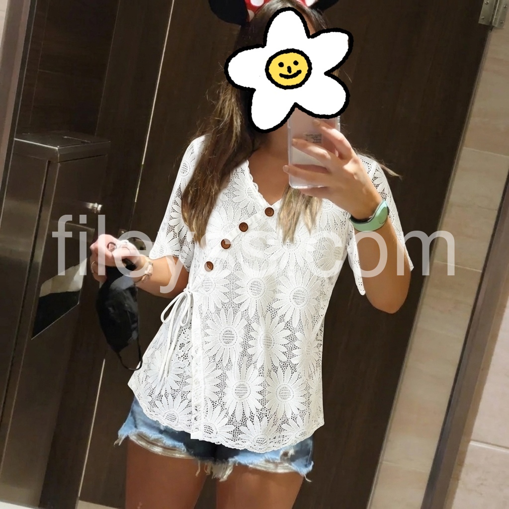 This lace blouse solves the “too plain or too fancy” dilemma. The daisy lace overlay adds romance, while the drawstring side lets you adjust the fit for a custom look.