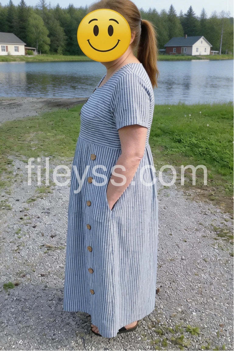 This dress is absolutely perfect! The blue and white stripes are so classic and the buttons add a nice touch.