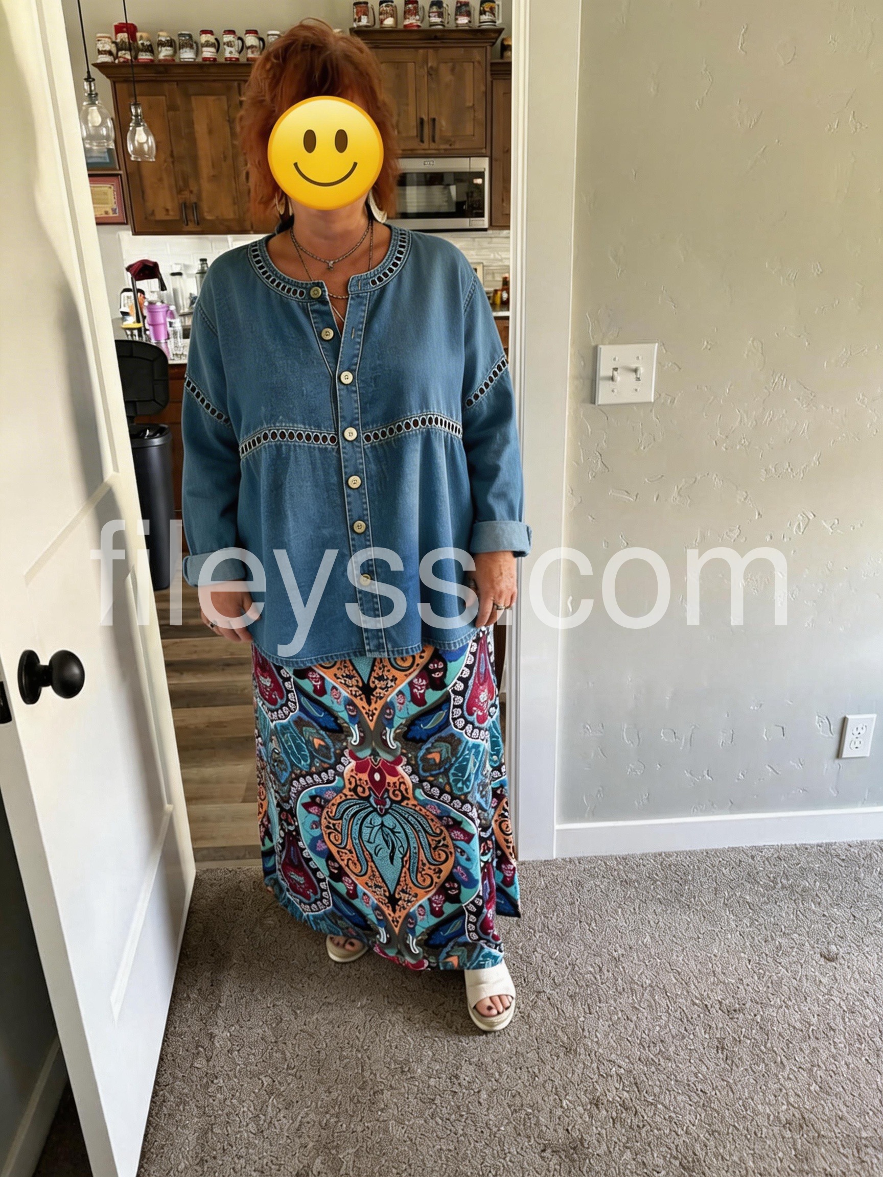 Embrace laid-back elegance in this Blue Denim Button Down Top with Embroidered Trim, a stylish and comfortable piece that blends classic denim appeal with artisanal details. Crafted from soft, medium-wash denim fabric, this tunic features a relaxed, oversized silhouette with a flattering round neckline and front button closure, offering both ease and timeless charm. The standout design element is the decorative embroidered trim—featuring a delicate dotted pattern—accenting the neckline and waistline, adding a touch of boho flair and texture. Styled here with layered necklaces, bracelets, and distressed denim bottoms, it’s ideal for weekend errands, coffee dates, or a leisurely walk through the city.