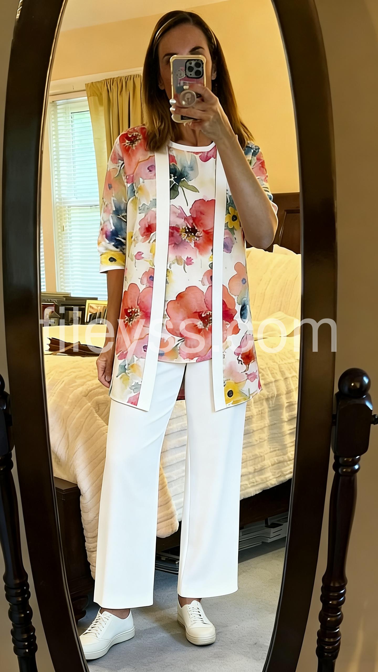 This three-piece set features a vibrant floral top and matching cardigan with white wide-leg pants. The relaxed fit offers comfort and elegance. Perfect for spring or summer occasions. Lightweight fabric ideal for casual outings. Effortlessly chic and coordinated.
