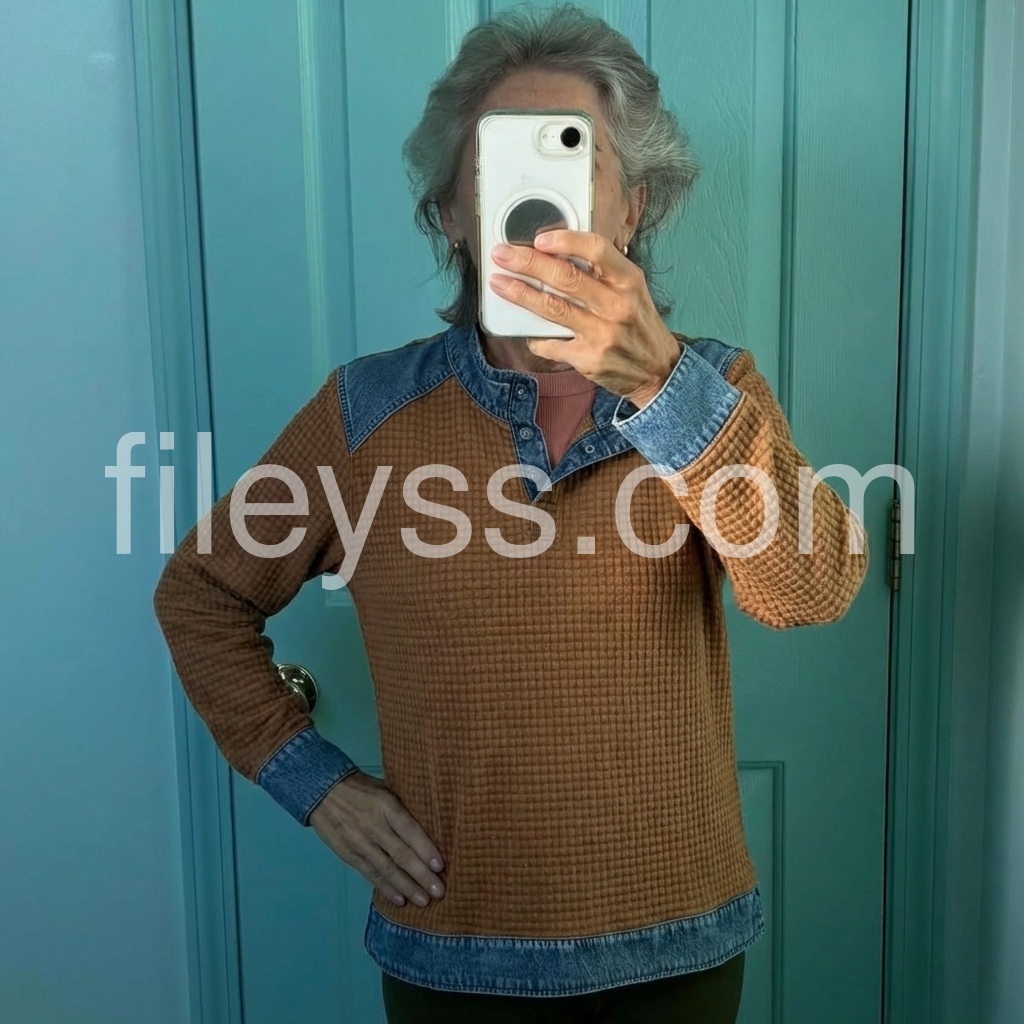 Crafted from premium denim, this long sleeve top features a sophisticated brown color block design that adds visual interest and versatility to your wardrobe. The structured fabric provides durability and maintains its shape through regular wear, while the extended sleeves offer practical coverage. The color blocking technique creates a modern silhouette that works seamlessly with both casual and elevated styling. Perfect for layering or wearing as a standalone piece, this top delivers timeless appeal with contemporary flair.