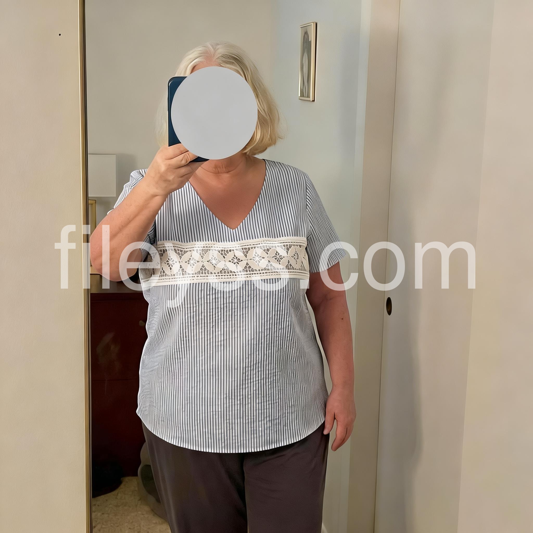 This blouse fits beautifully. It is loose enough to be comfortable but still gives a nice shape. The V-neck is very flattering. I wore it with white shorts just like the model and got so many compliments.
