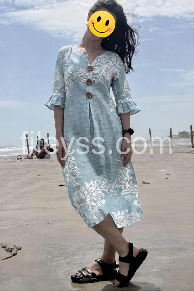 Blue Floral Ruffle Sleeve Button Linen Maxi Dress