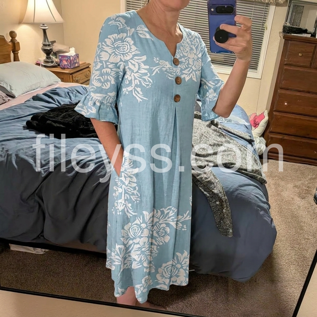 Such a great find! The fabric feels like a nice linen blend and doesn't cling to you at all. It is very forgiving around the tummy area while still giving a nice shape thanks to the pleat under the buttons. Perfect for a casual lunch or walking along the beach.