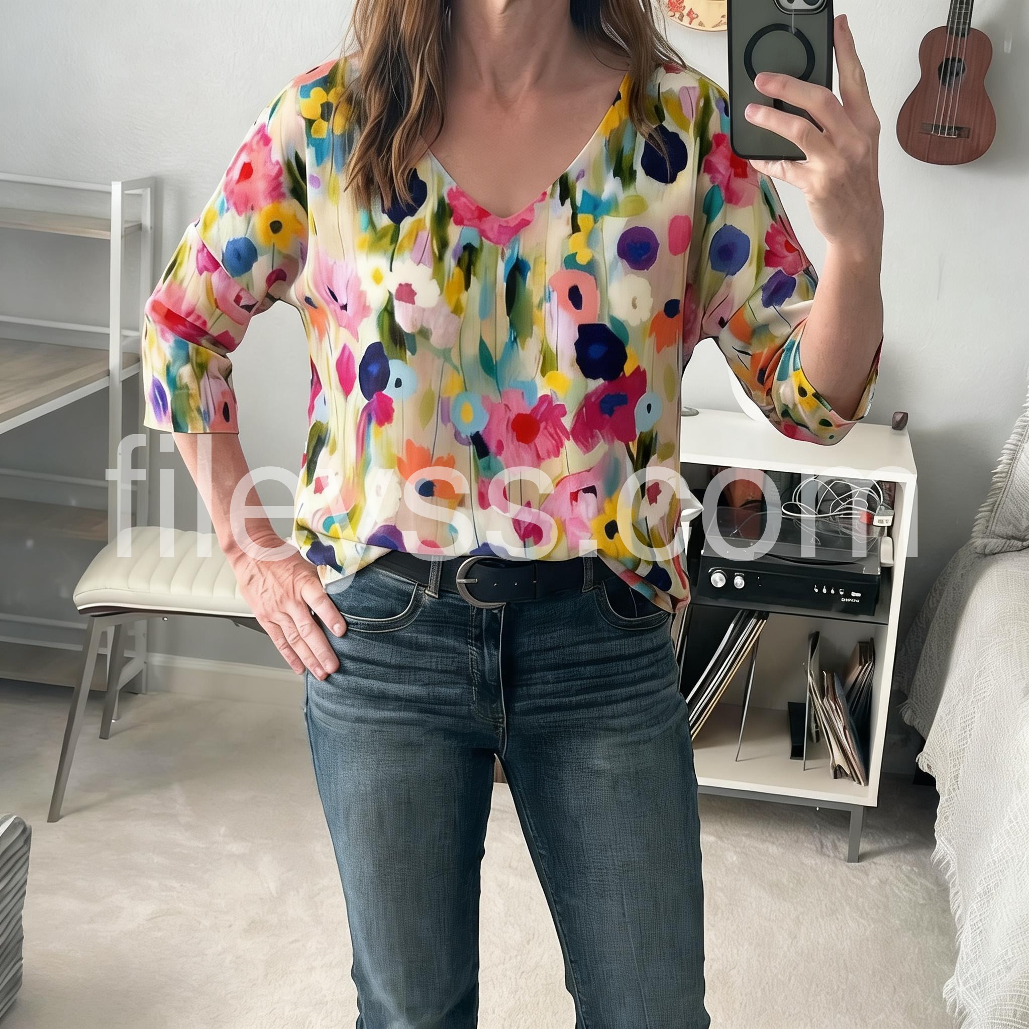 This flowy top features a colorful watercolor floral print on a soft beige base. Deep V-neckline and three-quarter sleeves with rolled cuffs. Lightweight fabric perfect for warm weather. Ideal for casual wear or beach outings. Effortlessly stylish and full of summer spirit.