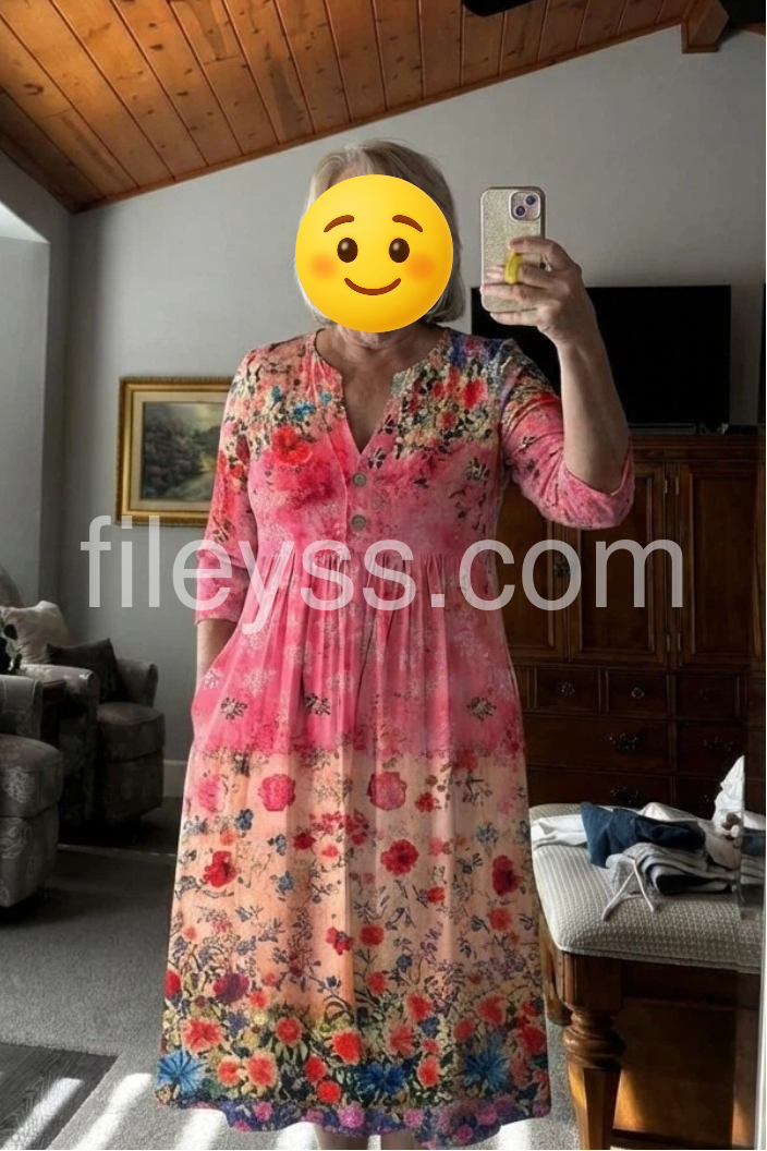 This midi dress features a vibrant floral print with a soft pink gradient and bold blooms. The V-neckline and three-quarter sleeves offer a flattering, relaxed fit. Side pockets add practicality and ease. Flowy A-line silhouette enhances movement. Perfect for garden parties or casual summer days.