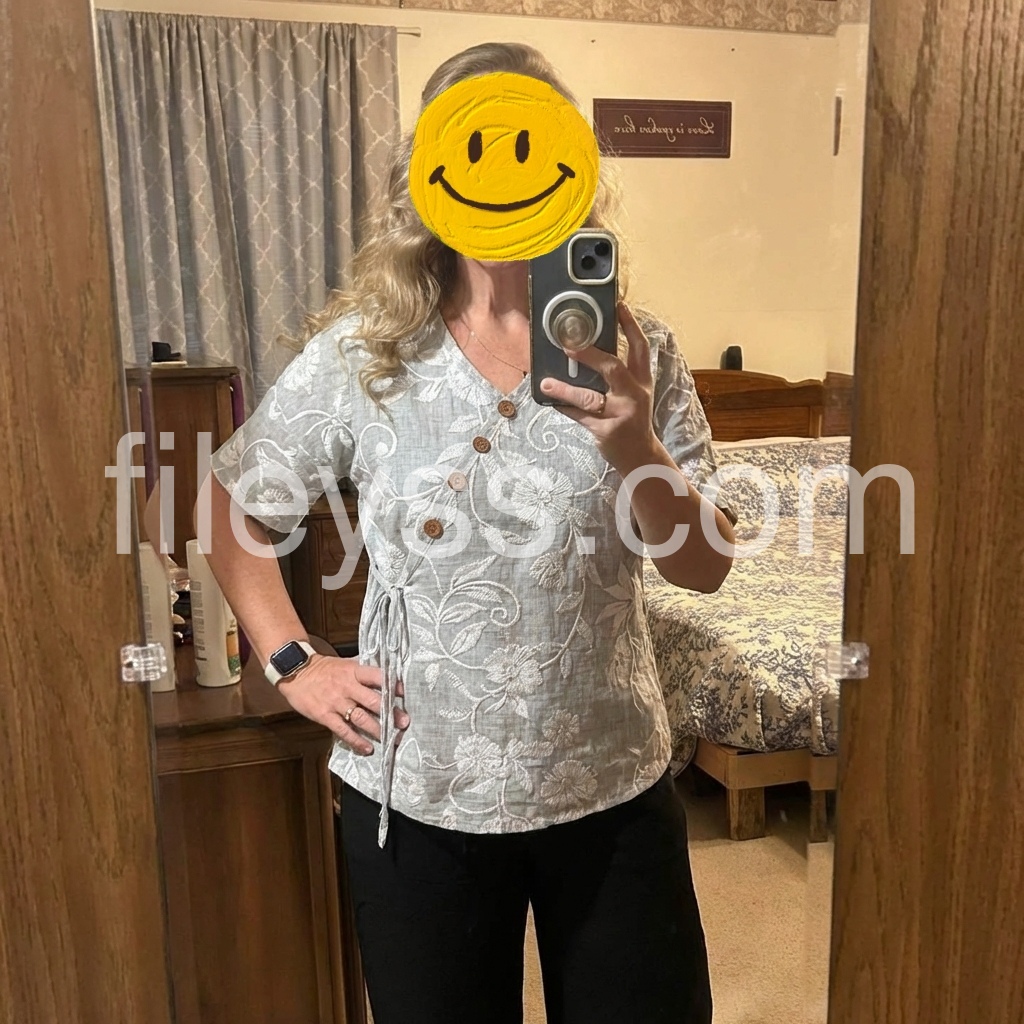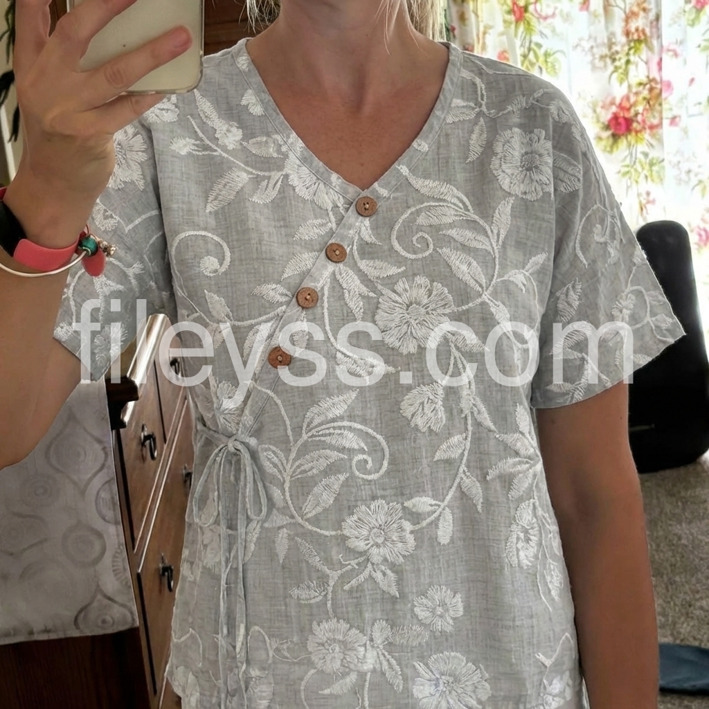 This short-sleeve top features a soft gray base with white floral print. V-neckline with wooden buttons and side tie detail. Relaxed fit for all-day comfort. Lightweight fabric perfect for casual wear. Ideal for pairing with jeans or pants.
