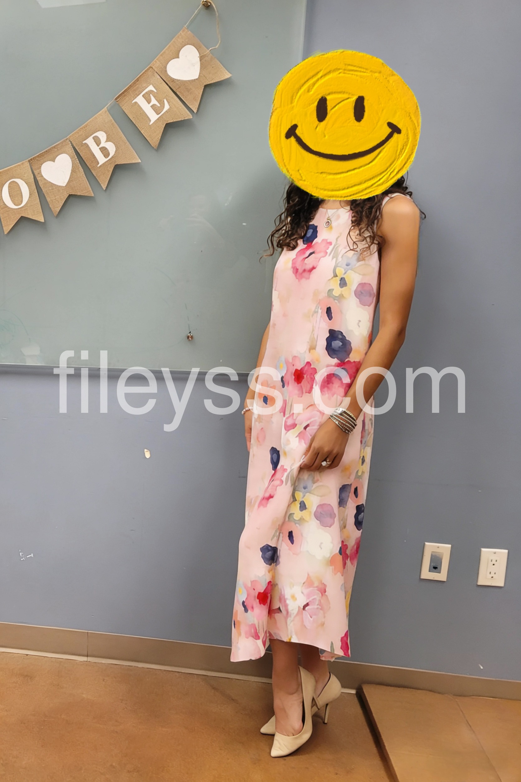 This sleeveless midi dress features a soft pink base with vibrant watercolor floral prints. The round neckline and flowy silhouette create a feminine look. Perfect for summer outings or resort wear. Lightweight fabric for comfort and ease. Ideal for casual elegance by the pool or beach.
