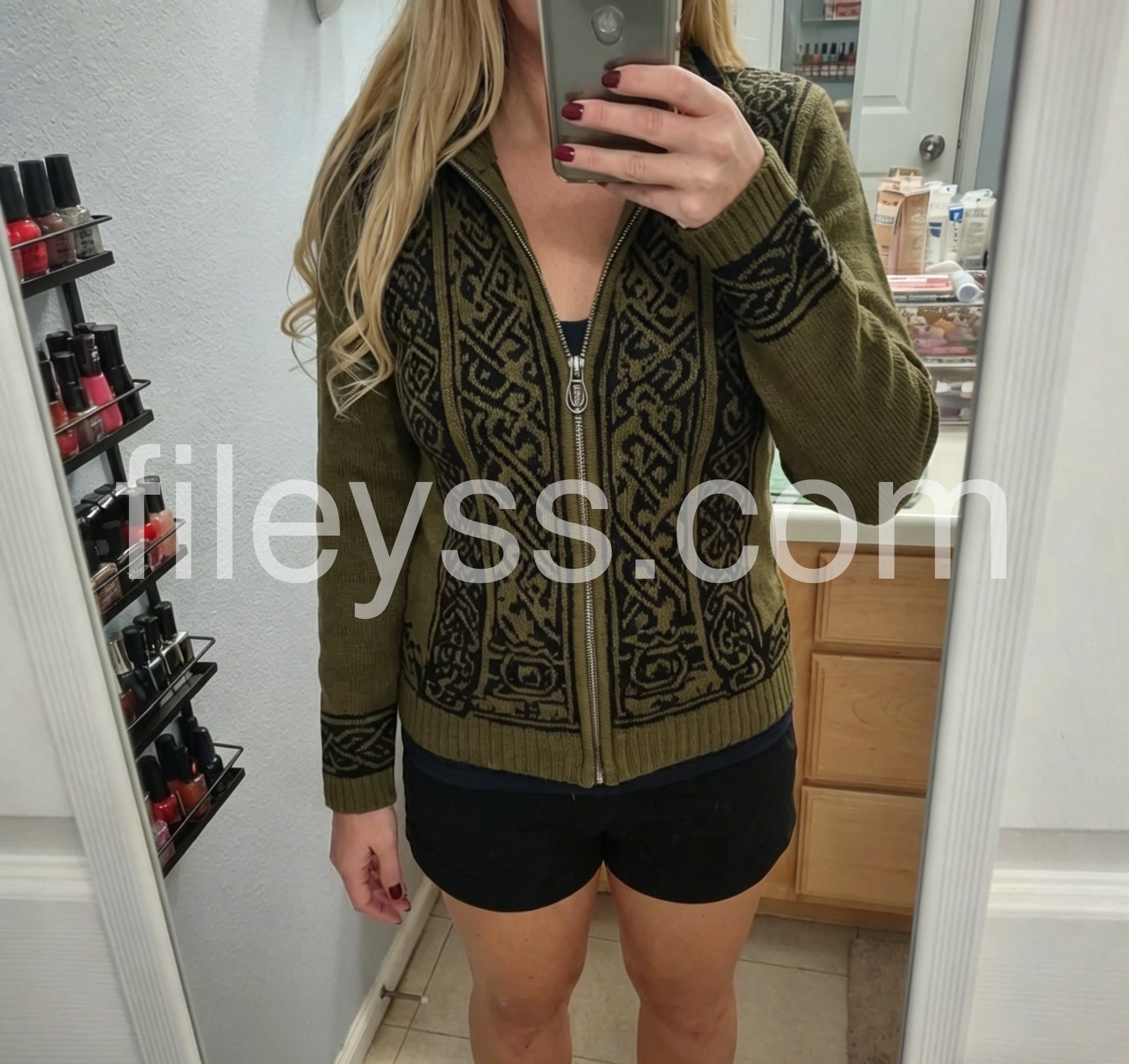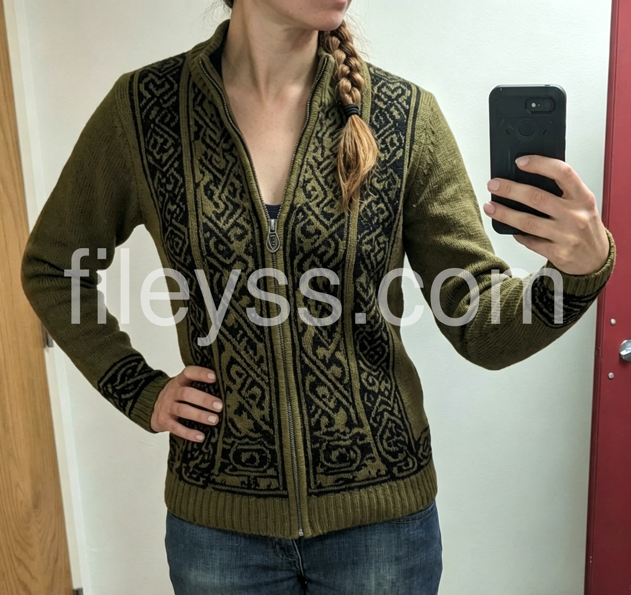 This olive green Celtic-pattern zip-up cardigan is such a standout piece! The thick, cozy knit is warm enough for crisp fall days, and the intricate black tribal-inspired pattern gives it such a cool, edgy vibe. The full-zip front makes it easy to layer, and the ribbed cuffs and hem keep the fit snug. I love pairing it with jeans and boots for a boho-rock look, and it gets compliments every time I wear it. The fabric is soft, durable, and holds its shape perfectly after washes.