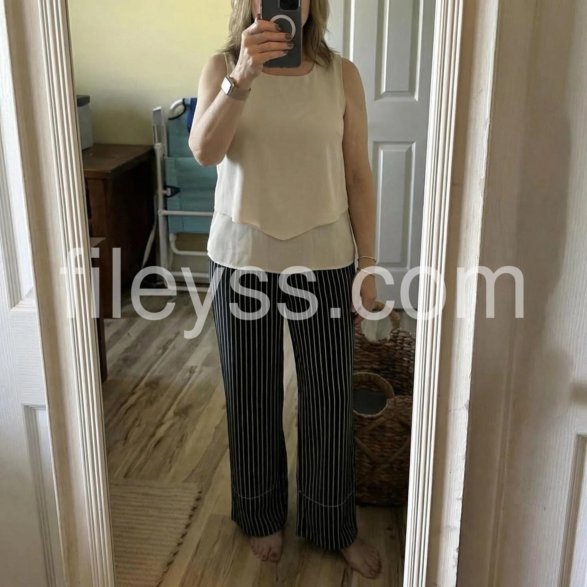 The vertical stripes on these wide-leg pants are incredibly slimming and make me look taller. The contrasting cream top balances the whole look beautifully.
