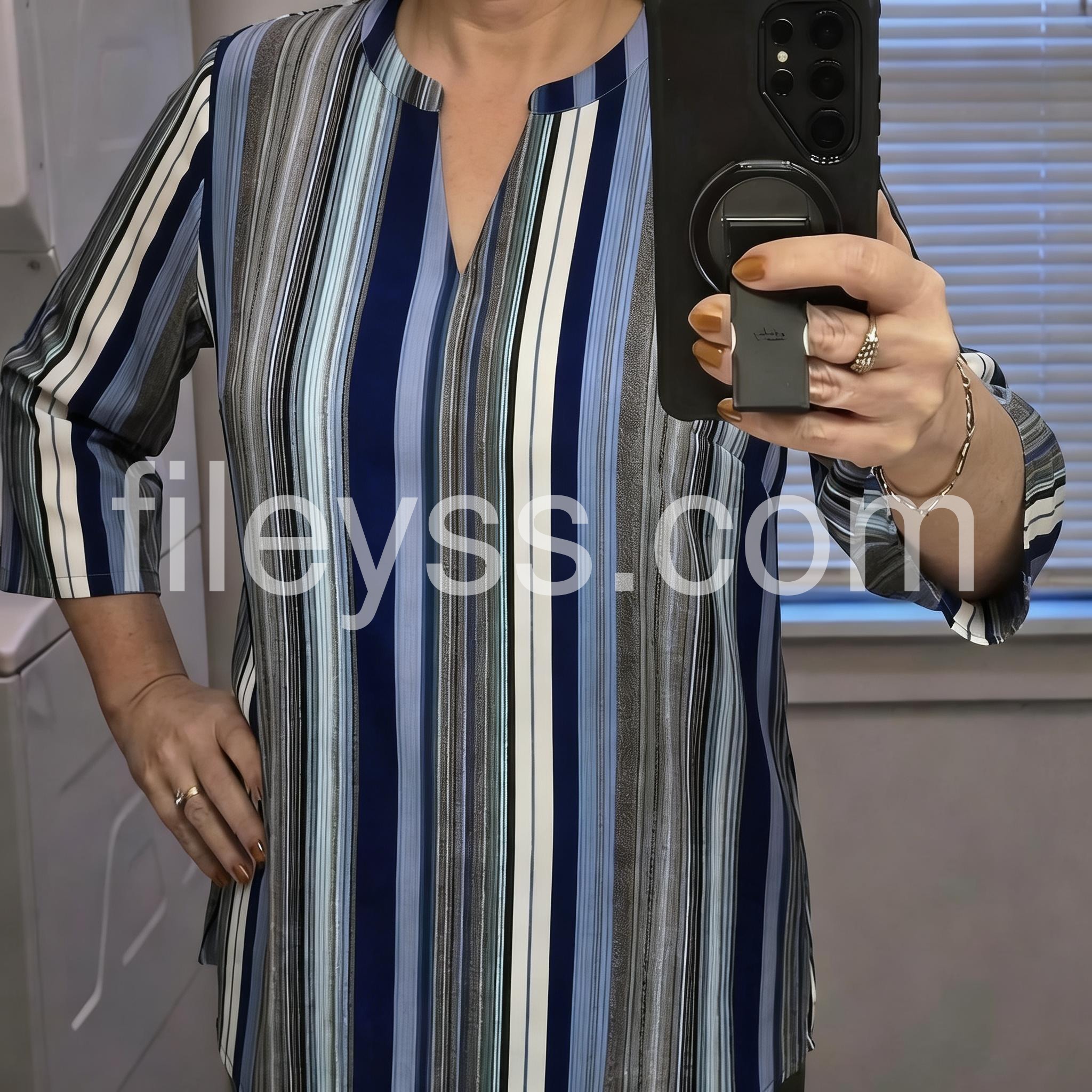 This loose-fitting top features vertical stripes in navy, blue, white, and gray for a modern look. The V-neck design adds a touch of elegance. Three-quarter sleeves with rolled cuffs offer comfort and style. Perfect for pairing with jeans or pants. Effortlessly chic for everyday wear.