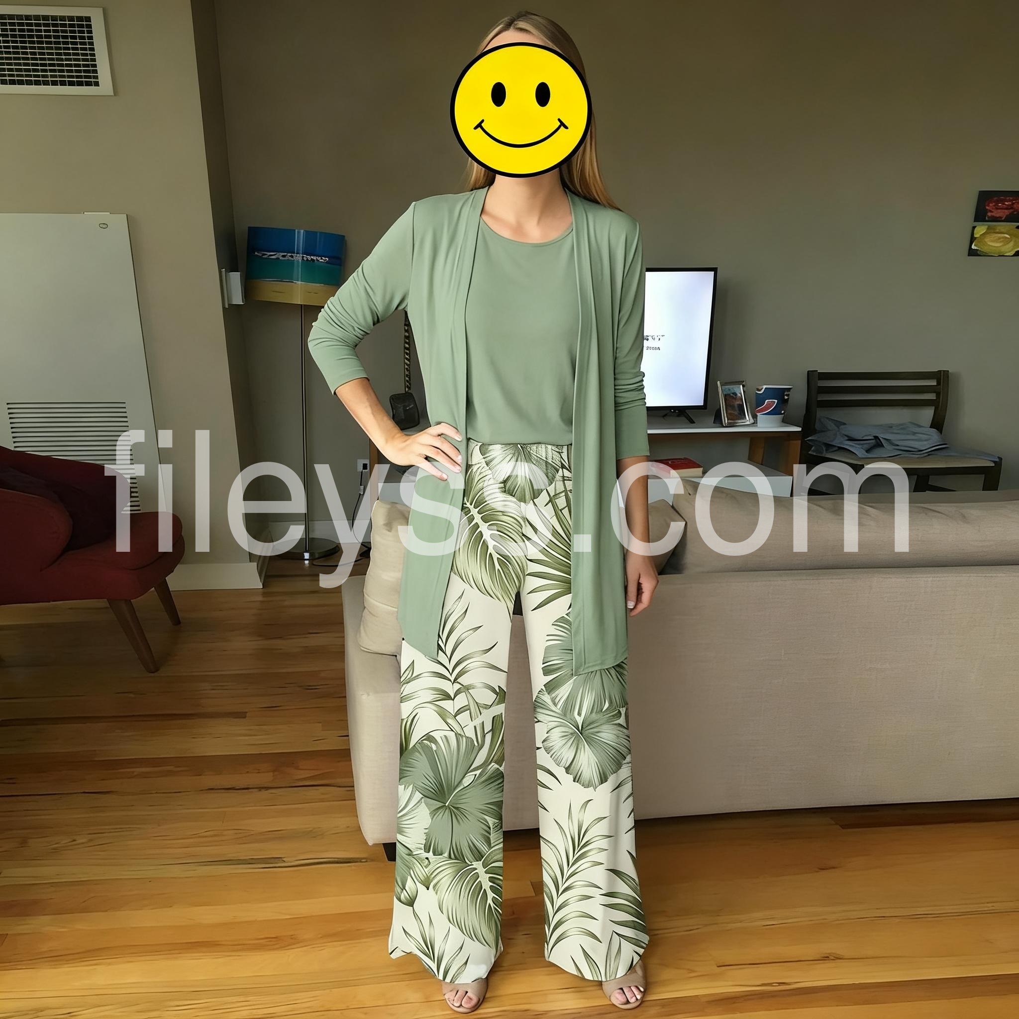Beautiful outfit! The tropical leaf print on the pants is so vibrant and matches the solid sage green top exactly. It feels like wearing pajamas but looks chic and put together. Washing it was a breeze, no shrinking.