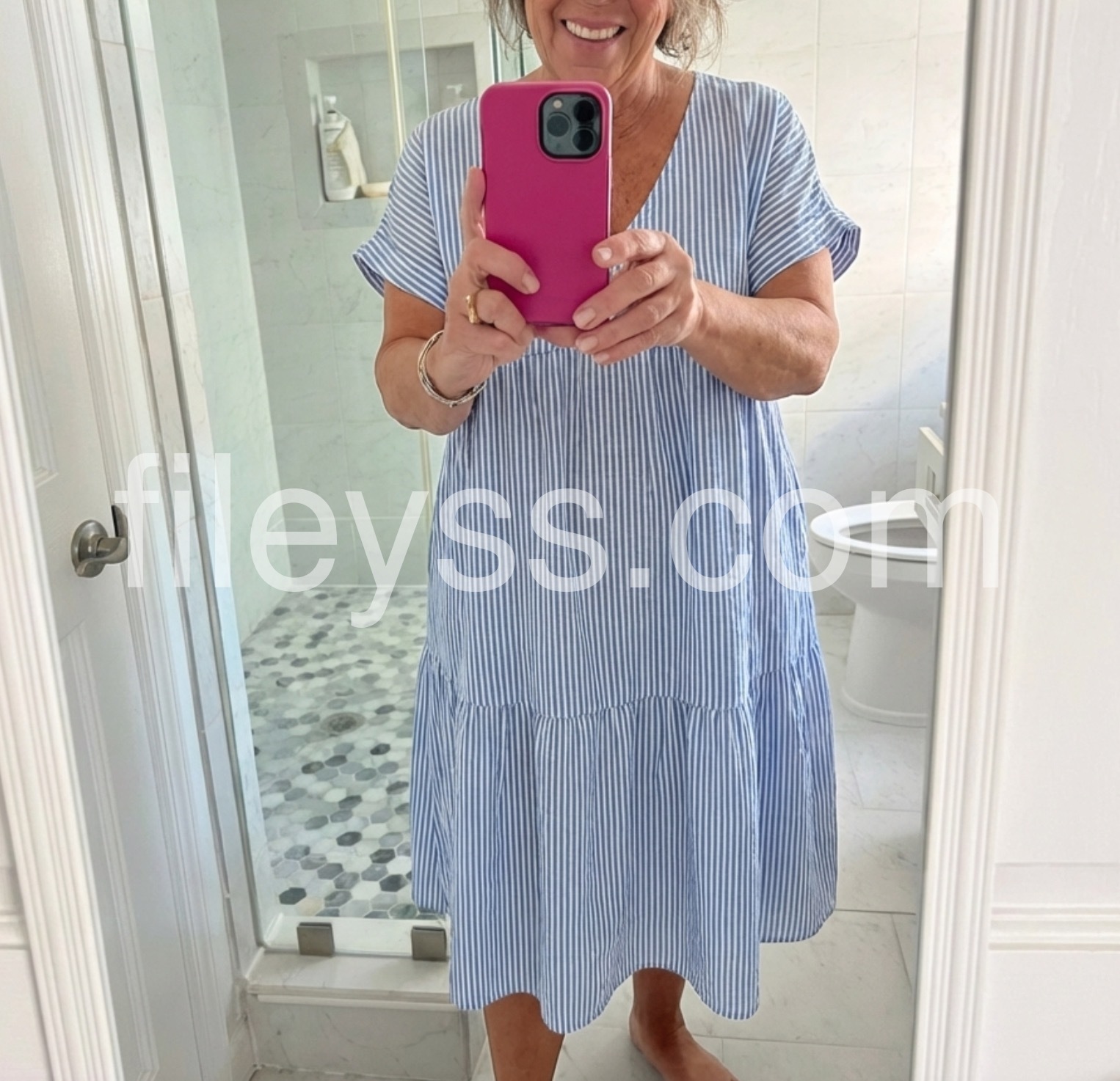 This Youthful Striped Print V-Neck Midi Dress is designed for the modern fashion-forward woman. Made with a flattering V-neckline and eye-catching striped print, this dress is versatile and perfect for any occasion. Its midi length adds a touch of elegance, while the youthful design adds a playful touch. Elevate your wardrobe with this must-have dress.