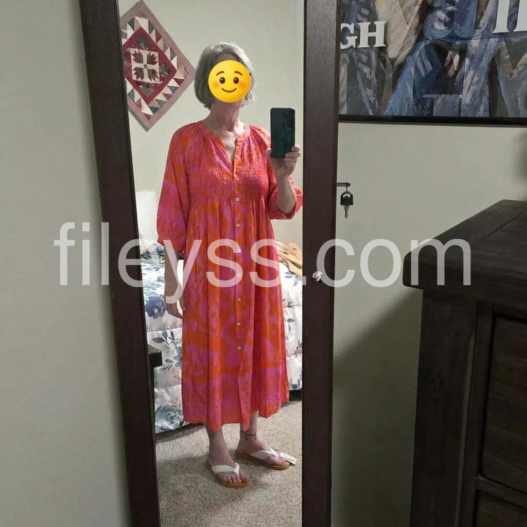 Absolutely love the vibrant pink and orange colors! It is so bright and perfect for summer. The fit is flowy and very comfortable.