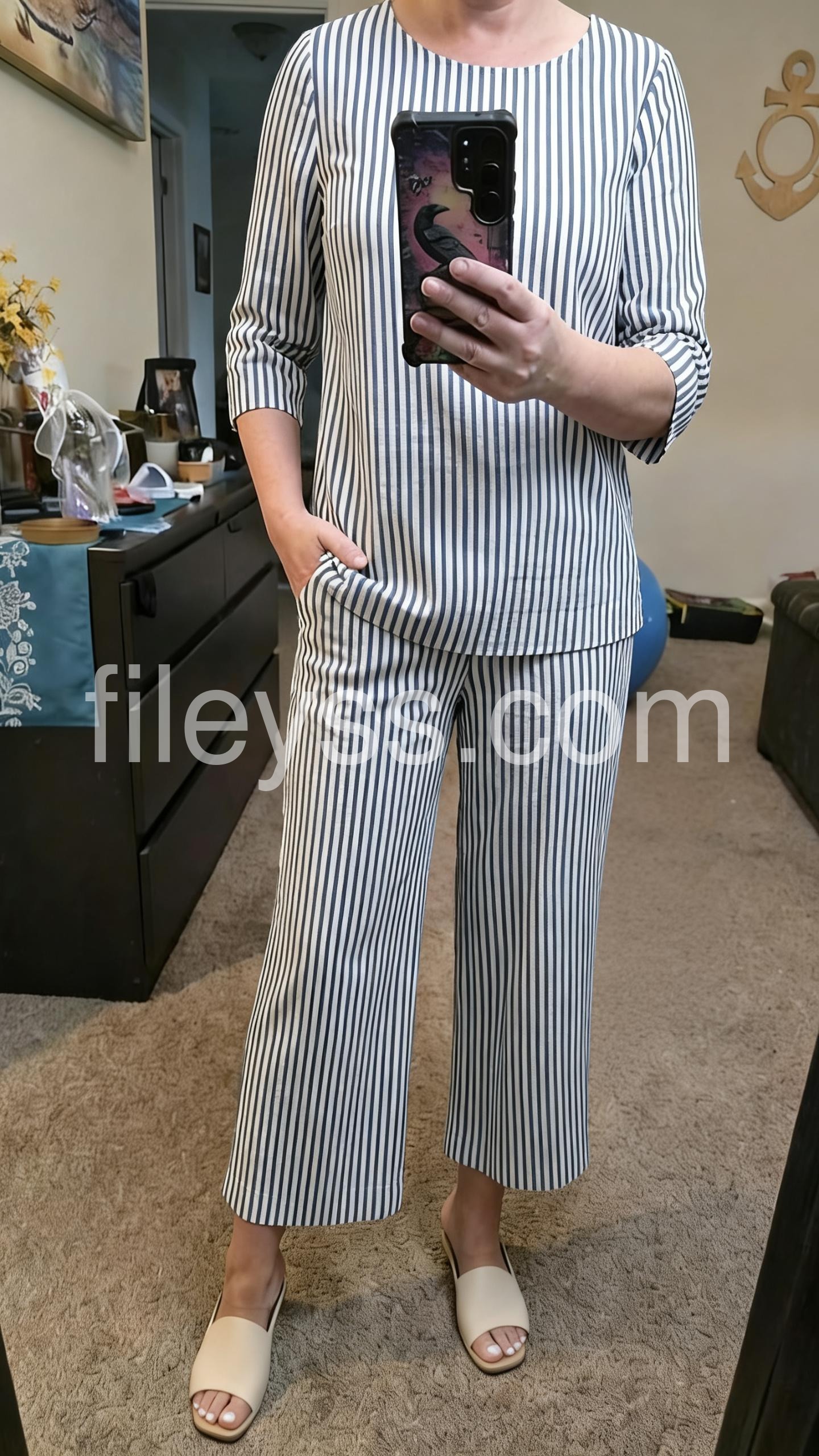This coordinated set features a relaxed-fit top and wide-leg cropped pants in classic blue and white stripes. The three-quarter sleeves and round neckline offer a clean, timeless look. Lightweight fabric perfect for warm weather. Ideal for casual outings or smart-casual events. Effortlessly chic and easy to style.