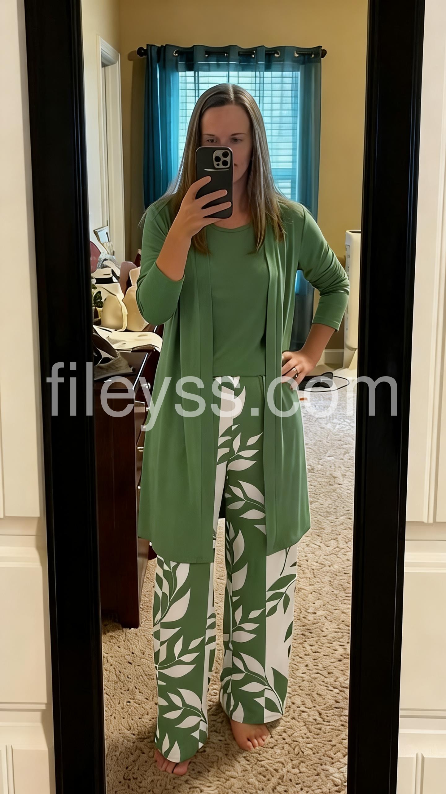 This three-piece set features leaf-patterned wide-leg pants in white and green, paired with a solid green top and open-front cardigan. The relaxed fit offers comfort and elegance. Perfect for casual outings or smart-casual events. Lightweight fabric ideal for warm weather. Effortlessly chic and easy to wear.