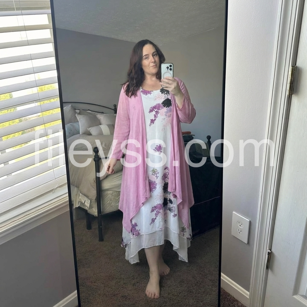 This outfit is gorgeous and so comfortable. The sheer outer layer hides my arms just the way I like, while the inner floral dress is soft and breathable. Fits true to size and drapes beautifully.