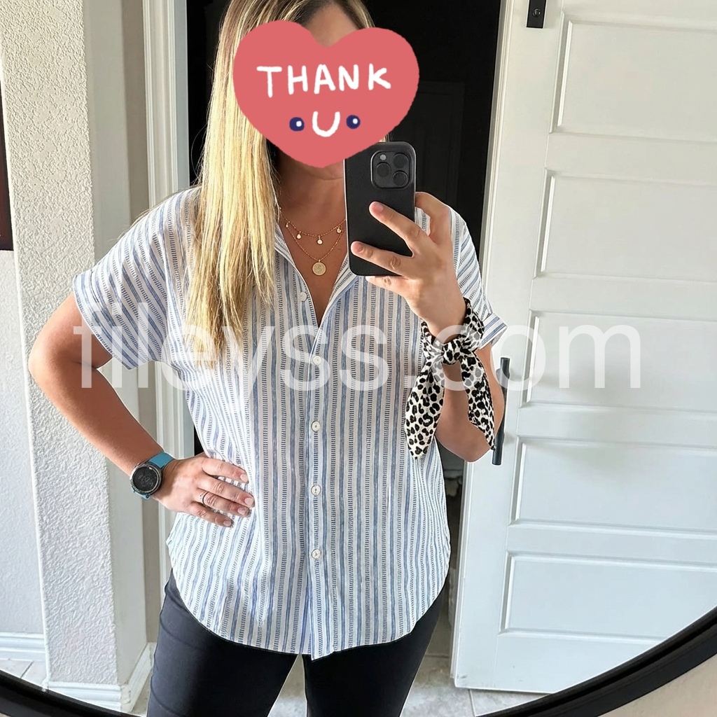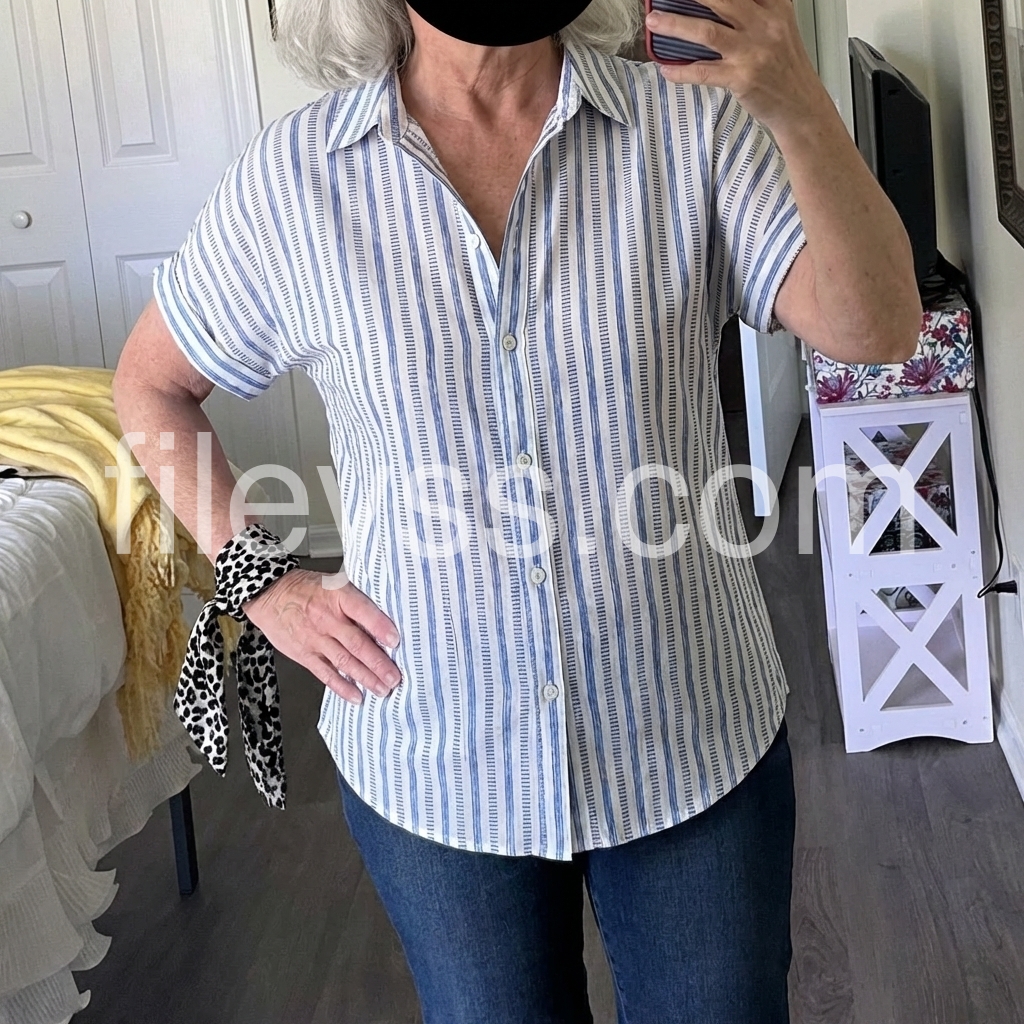 This button-down is so versatile. The blue and white stripes give it a classic nautical vibe. The material feels breathable, almost like a linen blend, which is great for hot days. Looks amazing paired with white jeans!