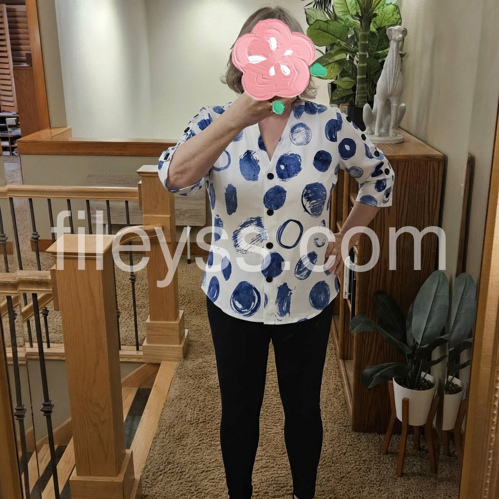 I absolutely love this top! The blue watercolor circles are so unique and vibrant. I wore it to a casual brunch and received so many compliments. The material is soft and breathable.