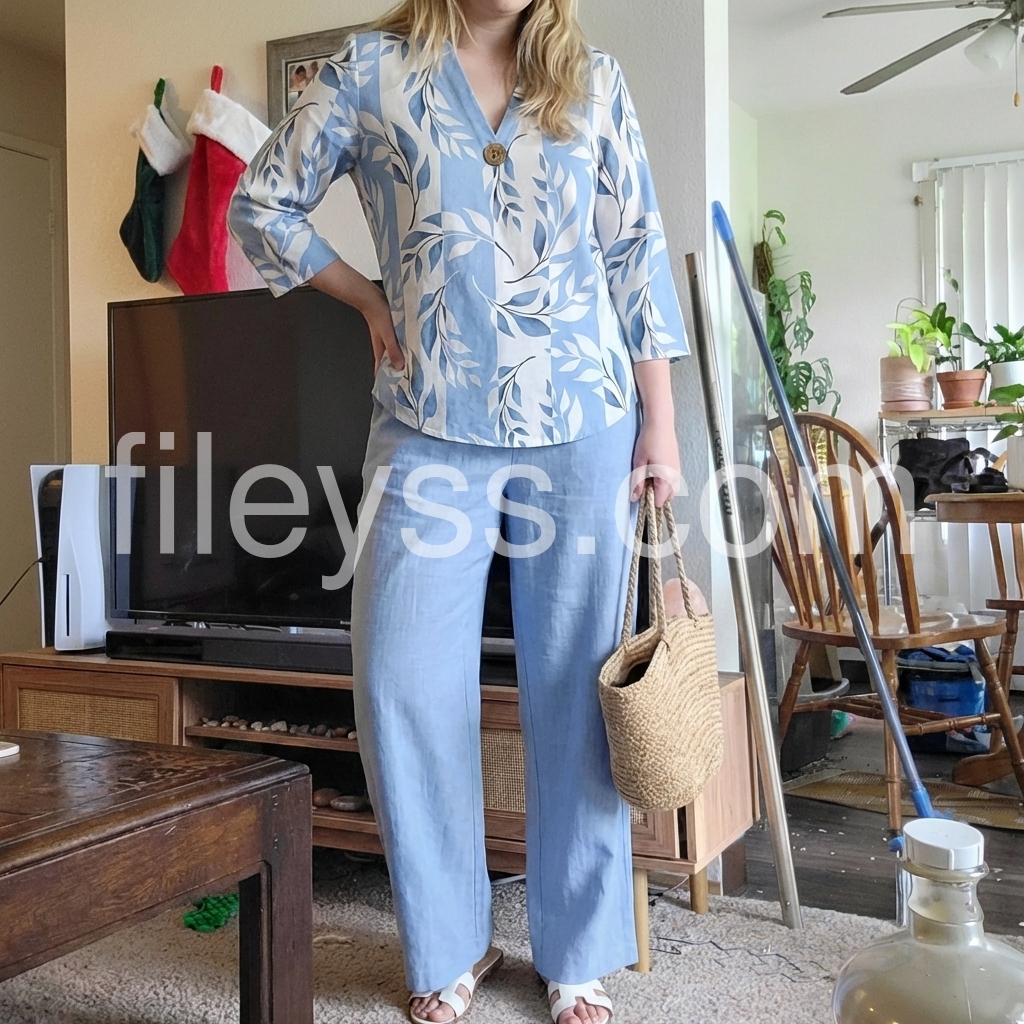 Hey fashionistas! This two-piece set is a total game-changer. The V-neck top with blue and white prints is super flattering, while the three-quarter sleeves add a touch of elegance.