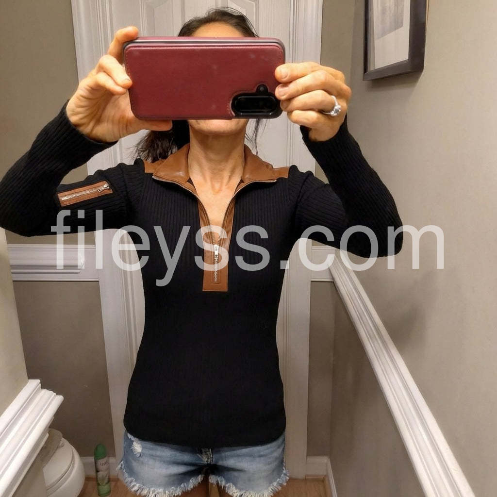 Chic Black Half Zip Long Sleeve Top