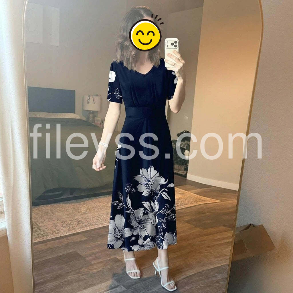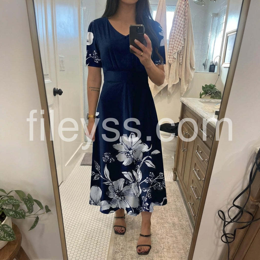 This blue short sleeve midi dress features a flattering V-neckline and a versatile length that suits various occasions. Crafted for comfort and style, its breathable fabric and tailored fit offer ease of movement while maintaining a polished appearance. Ideal for both casual and semi-formal settings, this dress combines simplicity with elegance for a timeless wardrobe staple.
