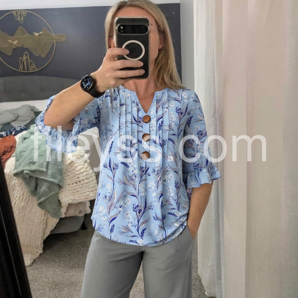 I get so many compliments every time I wear this blouse. The ruffled sleeves are a beautiful touch, and the wooden-style buttons give it a nice rustic vibe. Very comfortable for all-day wear.