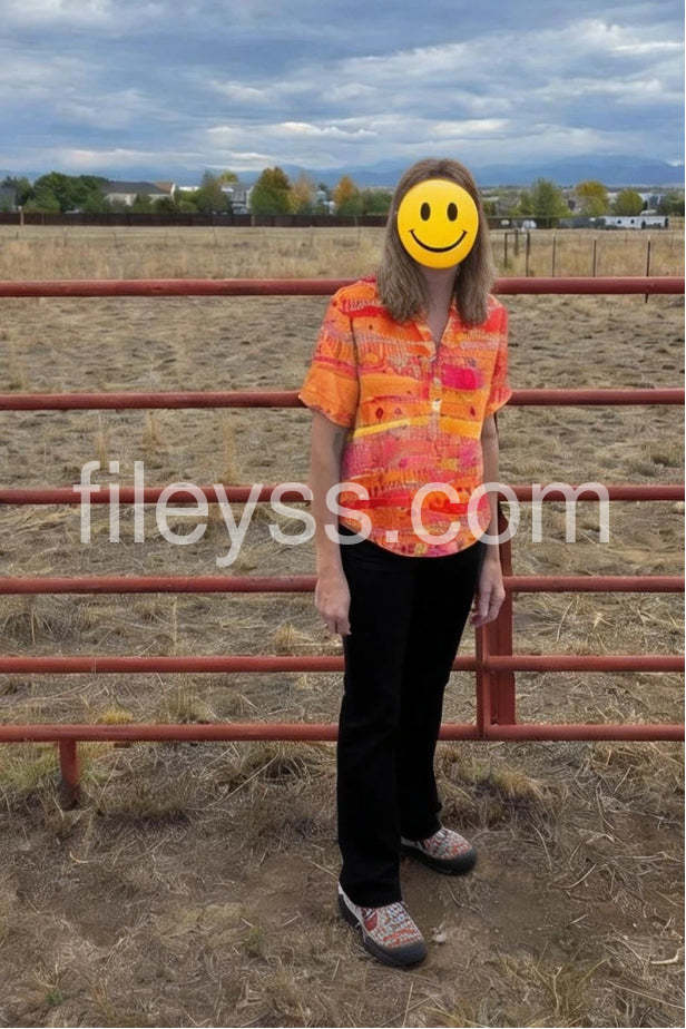 The star of the show is its eye-catching abstract print, featuring a dynamic interplay of bold orange, fiery red, and soft pink hues, reminiscent of a sunset or a modern painting. The relaxed, loose-fitting silhouette ensures all-day comfort, while the classic V-neckline and front button closure add a touch of timeless style.