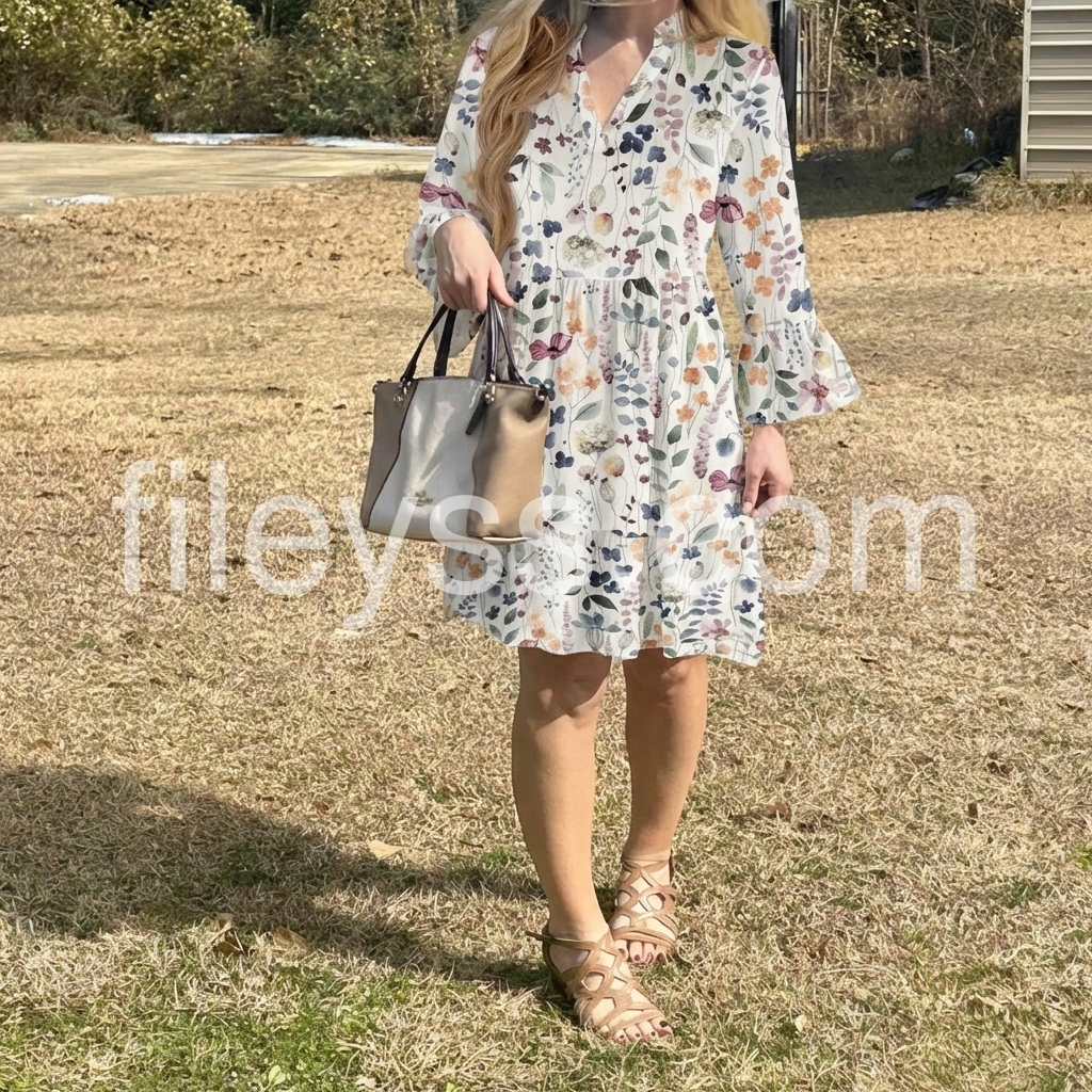 This white floral dress features a V-neck, button-down front, and flared bell sleeves. The tiered skirt adds movement and charm. Soft pastel blooms create a delicate, summery look. Perfect for beach days or casual outings. Lightweight and effortlessly feminine.