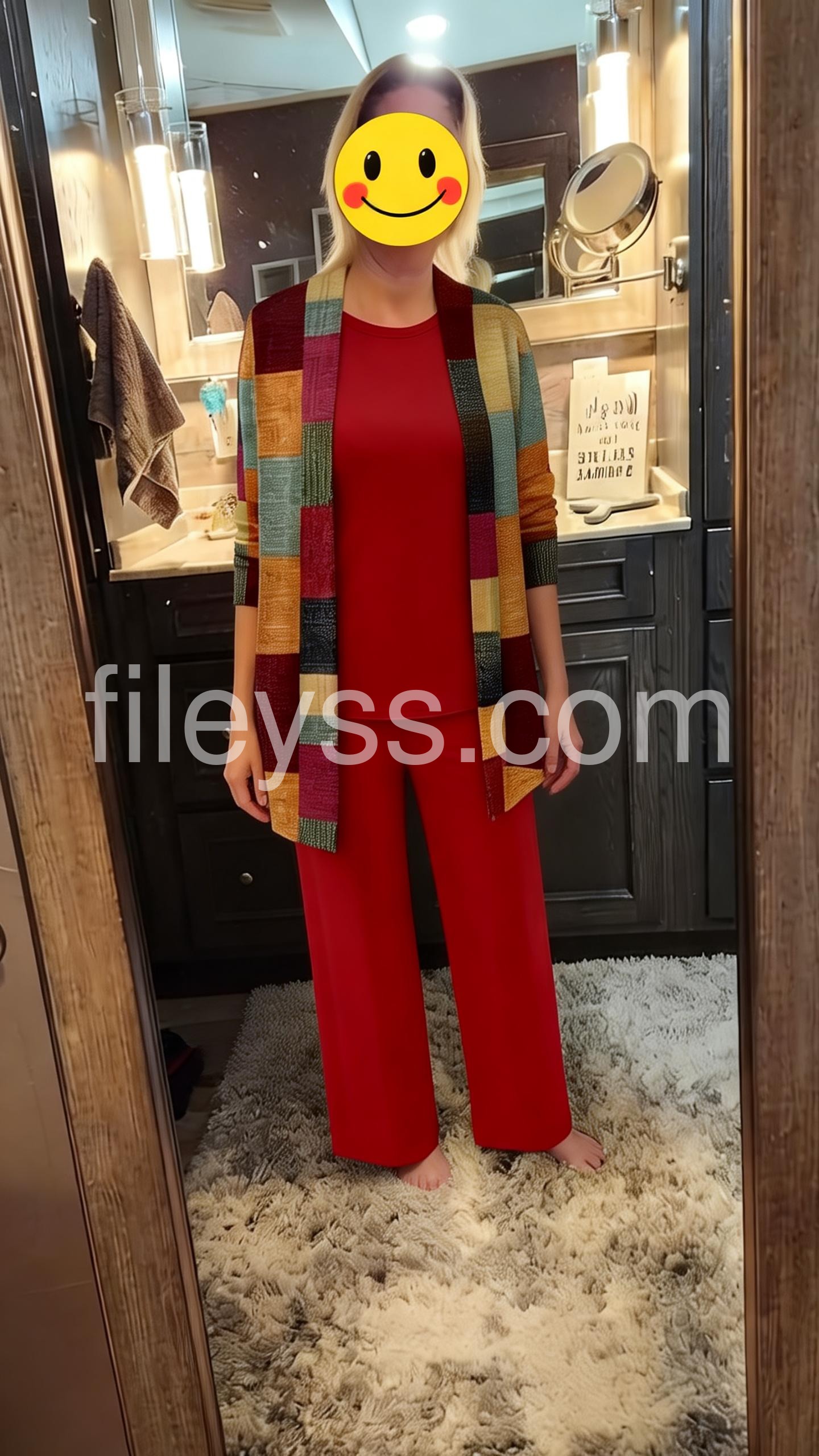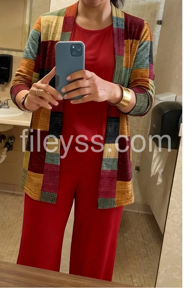 This coordinated outfit features a solid red top and wide-leg pants paired with a vibrant patchwork cardigan. The colorful, geometric design adds a modern touch. Comfortable and chic for casual or semi-formal wear. Perfect for autumn days or stylish outings. Effortlessly elegant with a pop of personality.