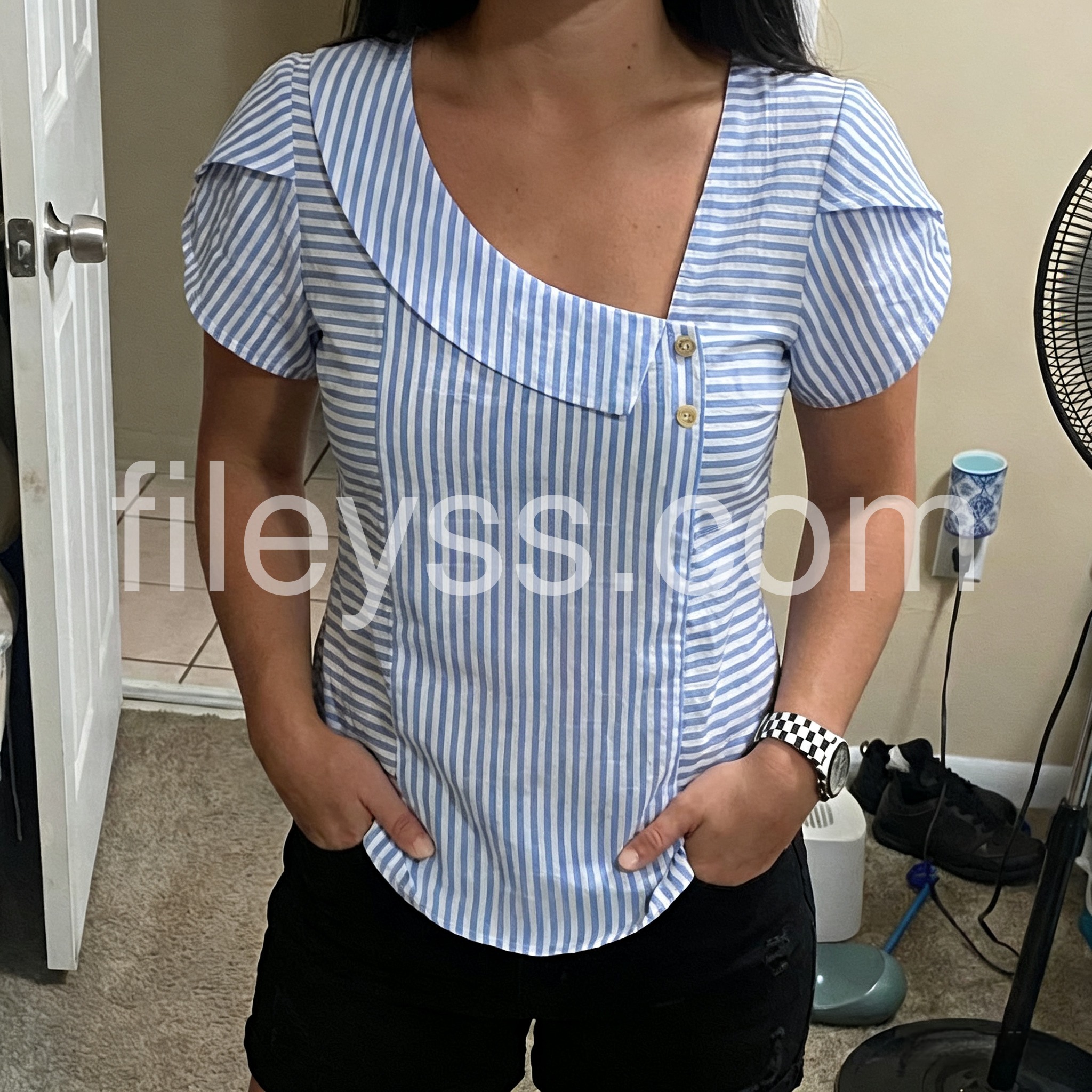 I absolutely love the unique neckline on this top! The asymmetrical collar with the little buttons adds such a cute touch to a classic striped shirt. It fits perfectly and looks great with my denim shorts. Highly recommend for summer!