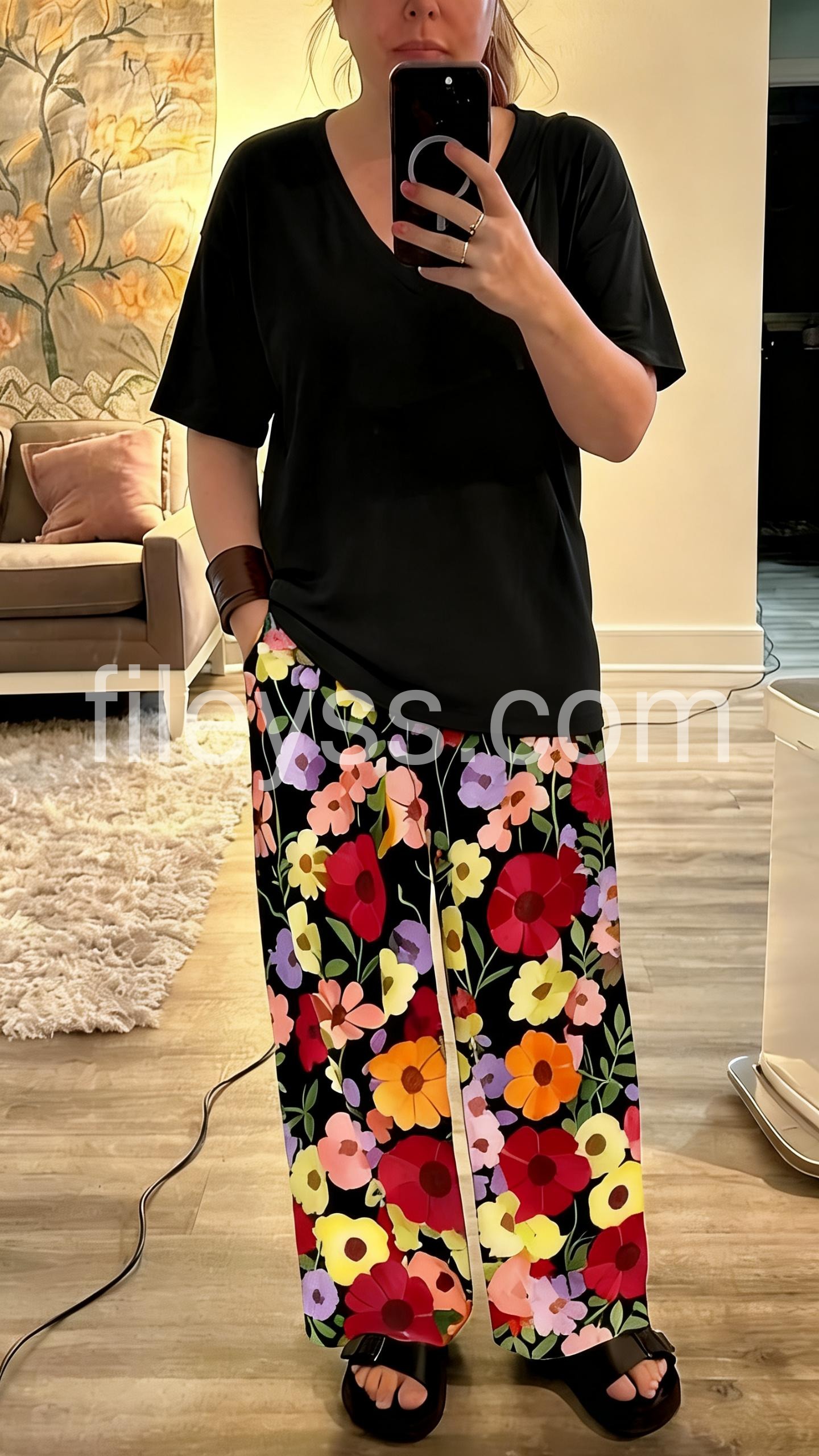 This coordinated set features a loose-fitting black V-neck top and wide-leg pants with colorful floral prints. The contrast creates a lively, eye-catching look. Lightweight fabric perfect for warm days. Ideal for casual outings or relaxed summer wear. Comfortable and effortlessly stylish.