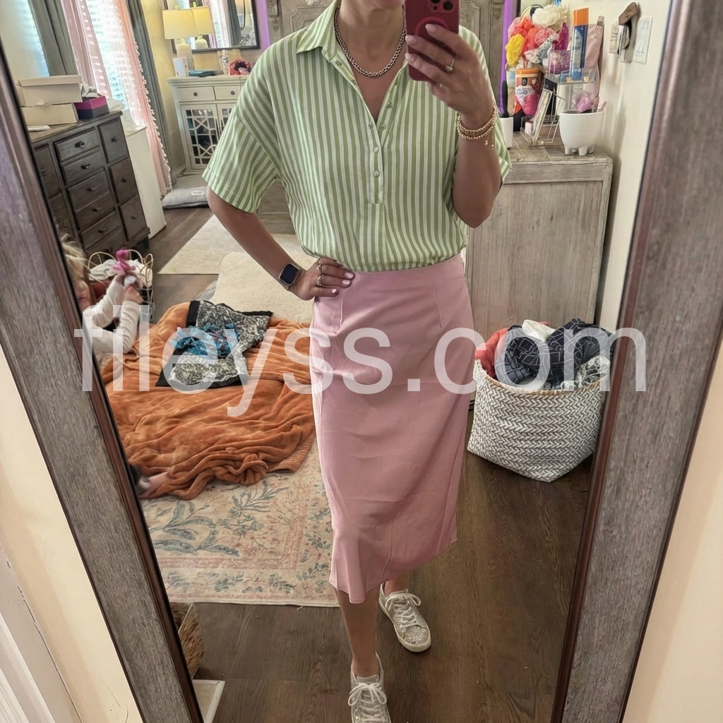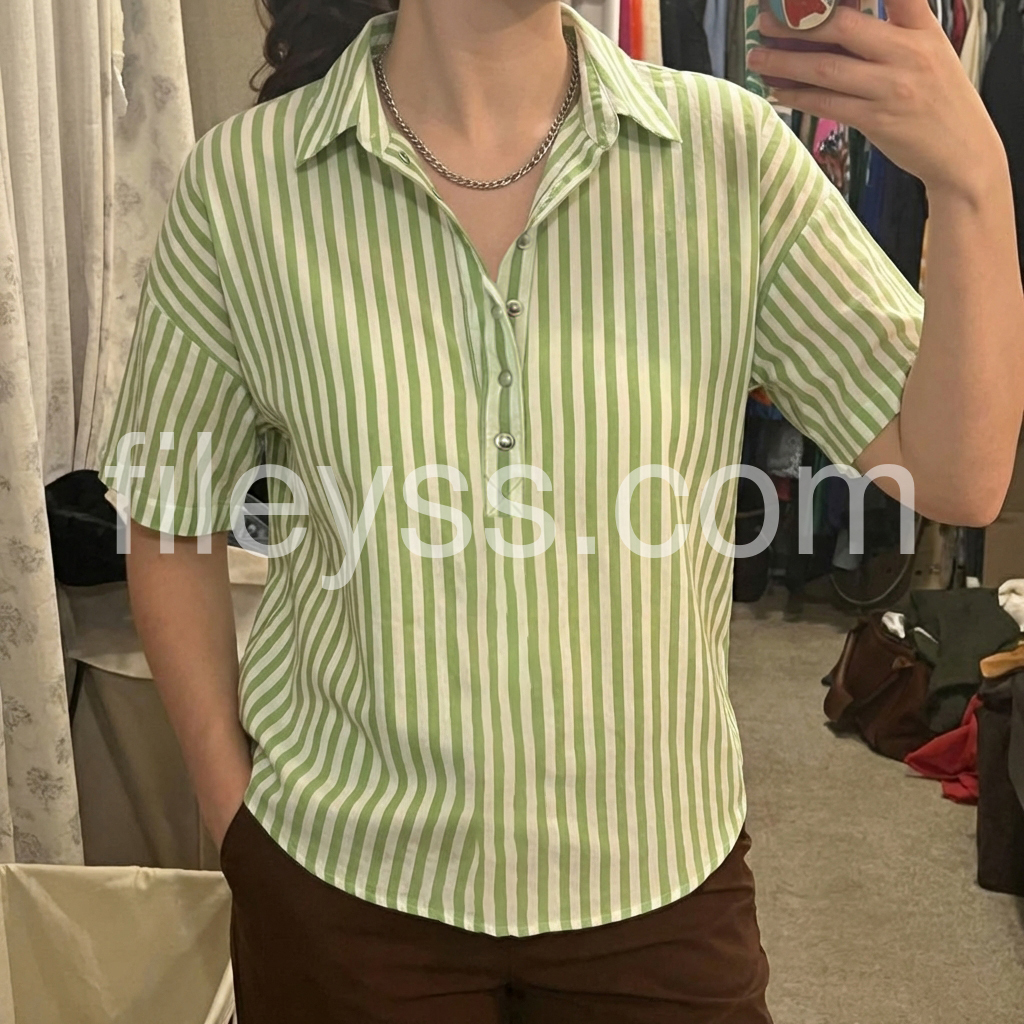 This blouse reimagines classic stripes with a modern, relaxed silhouette. The fresh green-and-white vertical print evokes timeless, preppy style.