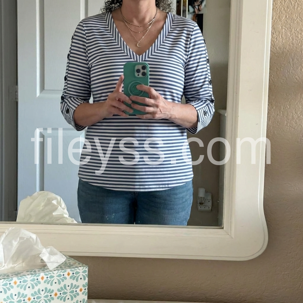 As a fashion editor, I love how this top reimagines the classic stripe with modern flair. The deep V-neck flatters every face shape, while the three-quarter sleeves with button accents solve the common issue of “boring basics” by adding subtle visual interest.