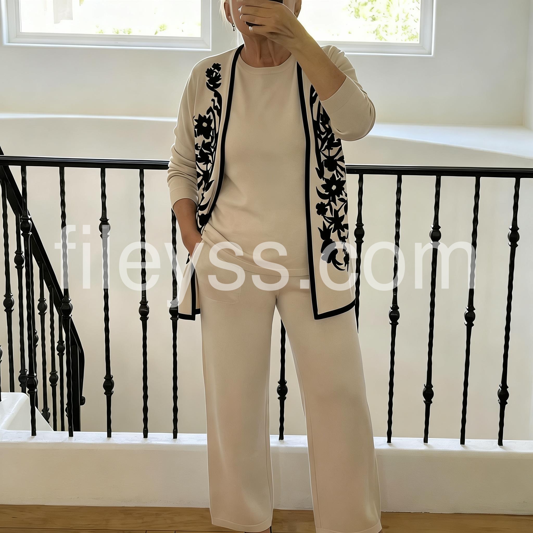 This coordinated three-piece set features a soft beige top, wide-leg pants, and an open-front cardigan with black floral embroidery. The clean lines and subtle contrast create a refined look. Perfect for casual outings or relaxed elegance. Comfortable, stylish, and effortlessly chic.
