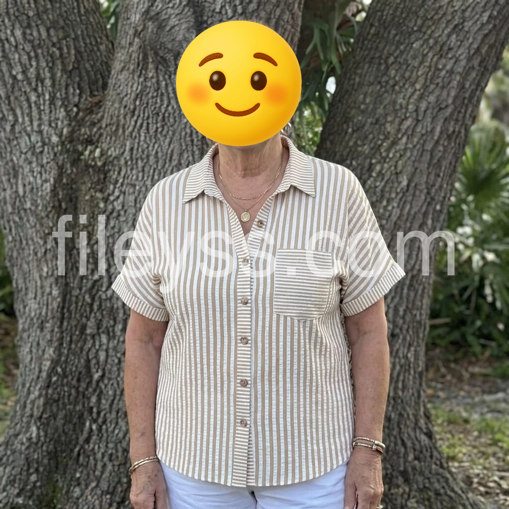 This short-sleeve shirt features vertical brown and white stripes with a classic collar. Front button closure and chest pocket add practical style. Soft, lightweight fabric for all-day comfort. Perfect for casual wear or layering. Effortlessly chic and easy to pair.