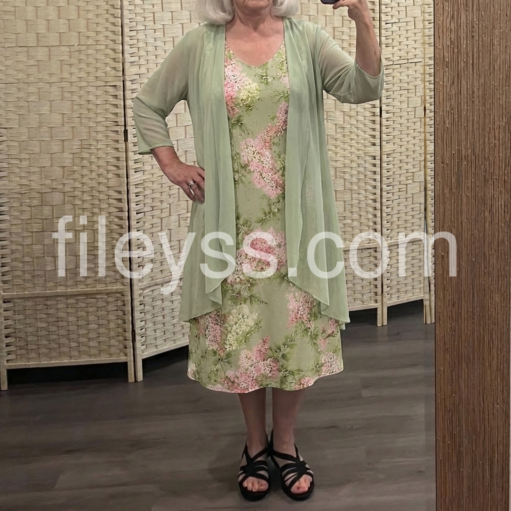 This soft floral dress features a light green base with pink and white blossoms. Paired with a matching sheer duster for a layered look. V-neckline and relaxed fit perfect for warm days. Ideal for garden parties or casual outings. Fresh and feminine style.