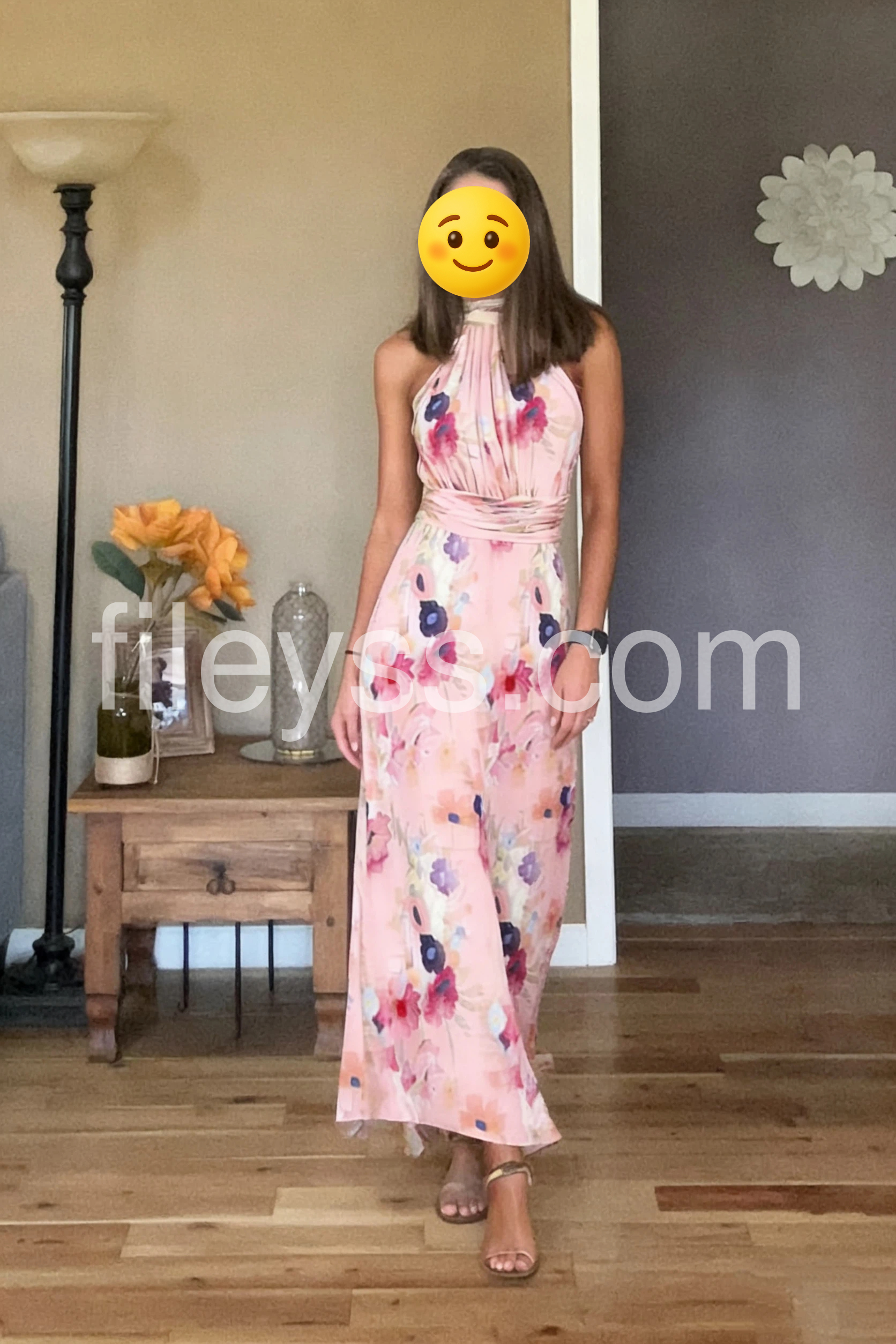 This halter-neck maxi dress features a soft pink base with vibrant floral prints. The ruched neckline and fitted waist highlight the silhouette. Lightweight fabric drapes beautifully for movement. Perfect for formal events or summer soirées. Effortlessly chic and feminine.