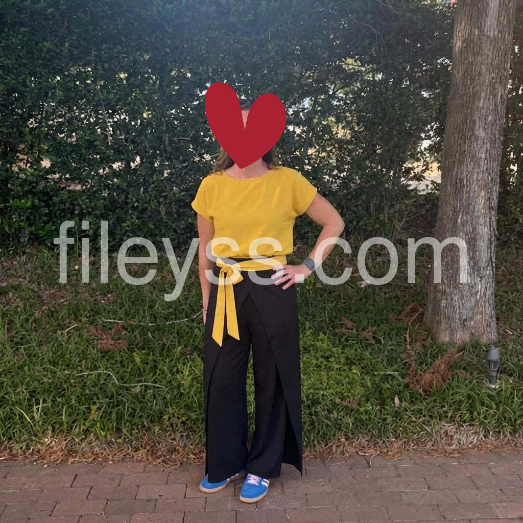 Love the bold color combo! The mustard-yellow top is airy and flattering, and the wide-leg black pants with the yellow waist tie create a chic, modern silhouette. Perfect for casual days out.